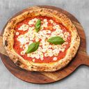 Pizza med San Marzano tomato sauce, mozzarella Fior di latte, parmesan, basil og olive oil.