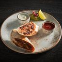 To eller tre tortillaer med langkokt svineribbe, bacon og ost. Serveres med salsa, syltet jalapeno/rødløk, pico de gallo, guacamole, ris og bønner.