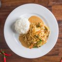 Kylling i kokosmelk med panang karri, limeblad og grønnsaker. Serveres med ris.