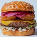 Plant-based beef patty, BBQ sauce, cheddar cheeze, crispy onion rings, pickled red onions & lettuce.