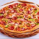 Pizza med kylling, biff, pepperoni, løk, paprika, champignon og ost.