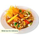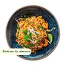 Stekte risnudler med kylling eller svin, peanøtter, cashewnøtter, egg og grønnsaker.