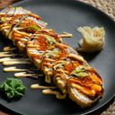 6 biter fritert futomaki med laks, marinert gresskar, philadelphia, avokado, lakserogn, agurk og oshinko.