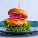Kyllingburger med salat, tomat, hvitløksdressing syltet rødløk.