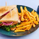 Sandwich with a whole chicken breast, bacon, salad, pickled red onion, tomato, mayonnaise, fries and garlic dressing.
