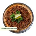 Den består av en tynn, flat brøddeig som er toppet med en smakfull blanding av kjøtt, urter og krydder, og deretter baket til den er sprø og gyllen. Følger med ferske grønnsaker.