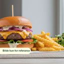 180g. Burger med pommes frites, salat, gulrot coleslaw, chili cheddar og aioli.