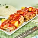 Kyllingen var brent. Det var ingen grønnsaker med. Og sausen minte mer om ketchup i både konsistens og smak.