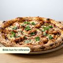 Pizza med kylling og smaksrik BBQ-saus. Krydres med grønt, lyst pizzakrydder og chiliflak.