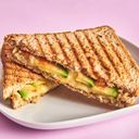 Toast med halvgrovt brød, kyllingbiter, avokado, mozzarella/cheddar ost, pesto og tomat.