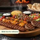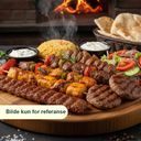 1 biffspyd, 2 kyllingspyd, 2 köfte, 1 adana, 2 kyllingkoteletter, 2 lammekoteletter og 2 kyllingfileter. Serveres med bulgur, salat, tzatziki og brød.