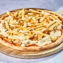 Pizza med tomatsaus, ost, kyllingkjøtt, pommes frites og saus. Velg størrelse.