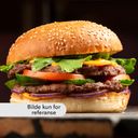 Saftig hamburger laget av 100% norsk storfekjøtt fra Gilde. Serveres med ost, bacon, dressing, salat, løk, tomat og grillkrydder.