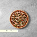 Pizza med kjøttdeig, pepperoni, paprika og champignon.