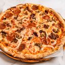 Pizza med biff, pepperoni, skinke, ost, sjampinjong og tomatsaus.