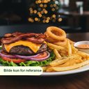 200g. Okseburger med bacon, cheddar, salat, tomat og løk. Serveres med løkringer, dressing og pommes frites.