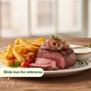 Grillet indrefilet med løk, tomat, pommes frites og hvitløksaus.