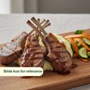 Grillet lammekoteletter med potetmos, peppersaus og sauterte grønnsaker (gulrøtter, zucchini og brokkoli).