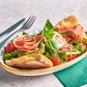 Salat med cherrytomat pachino, burrata DOP Antica Fattoria, artisjokk, mandler, parmaskinke 24 mnd. og pesto.