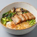 Med ramen-nudler, posjert egg, soyabønner, pak choi, vårløk, shiitake og spinat.