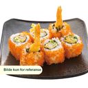 6 biter maki med fritert laks, agurk, avokado, flyverfiskrogn, teriyaki saus og mango mayo.