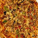 Tomatsaus, ost, biff, kylling, løk, jalapeno.