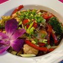 Stir-fried red curry with chicken, sweet basil, bamboo, bell peppers, longbeans and broccoli, topped with fresh basil leaves.