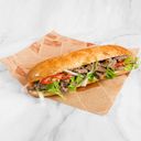 Spesial baguette med ribbe og pølse sprø svineribbe. Vietnamesisk svinepølse (chả lụa) med syltede grønnsaker, pâté, koriander og majones i en luftig baguette.