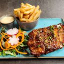Møre spare ribb med koreansk bbq glaze og chilimayo, serveres med enten ris eller pommes frites.