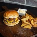 Burger med brioche boller, storfekjøtt, aioli, cheddar ost, egg, sprøstekt bacon, krispy salat, løk, tomat, BBQ saus og pommes frites.