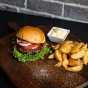 Burger med brioche boller, storfekjøtt, aioli, løk, tomat, crispy salat, BBQ og pommes frites.