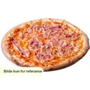 Pizza med tomatsaus, ost, bacon, pepperoni, skinke, løk, tomat og paprika.