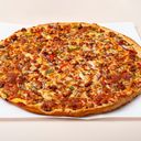 Pizza med biff, skinke, pepperoni, kylling, kjøttdeig, bacon, paprika, oliven og løk.