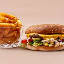 Cheeseburger med salat, mais, agurk, tomat, løk og dressing. Serveres med pommes frites.