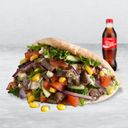 Kebab av okse- og lammekjøtt med isbergsalat, grønnsaker og dressing. Serveres med valgfri drikke. Velg størrelse for pita eller rull, eller bytt til tallerken.