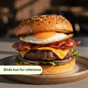 Kraftig burger toppet med stekt egg, ost og bacon.