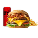 Dobbelburger av norsk storfekjøtt, smelteost med cheddar, bacon, gul løk, tomat, isbergsalat, original dressing og friscobrød. Serveres med drikke og tilbehør. 5,6 kg CO2e