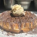 Varm vaffel toppet med fløyelsmyk nugatt sjokolade saus, karamell saus og myke karamel fudge. Serveres med salt karamell kuleis