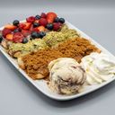 Varm vaffel smøret med fløyselsmyk nugatt, hvit sjokolade og toppet med ferske jordbær, blåbær, banan og bringebær. Følger med is-kule