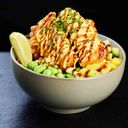 Fried scampi served with rice, avocado, mango, cucumber, soybeans. Topped with spicy mayo, teriyaki sauce, chives and lime wedges.