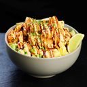 Breaded salmon served with rice, avocado, mango, cucumber and soybeans. Topped with teriyaki sauce, spicy mayo, chives and lime wedges.