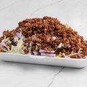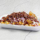 Serveres med ekstra mengde sprøstekt bacon, rømme, mais og ost.