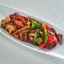 Wok med indrefilet av okse, grønnsaker, hvitløk, chili og kinesisk ma-la pepper. Serveres med ris. Medium sterk.