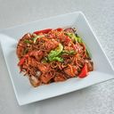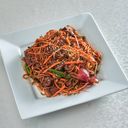 Nudler med biff og assorterte grønnsaker i asiatisk saus. Velg mellom stekte nudler eller risnudler.