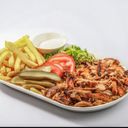 Kombinasjon av kebab og kylling med salat, agurk,tomat,mais, løk, pommes og dressing.