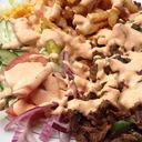 Biffkjøtt, pommes, salat, paprika, lokk, agurk, tomat, dressing.
