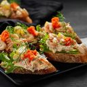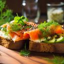 Gravet rød fisk og husets cream cheese mix, på surdeigsbrød, toppet med syltede grønnsaker wasabi-sesamfrø.