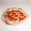 Pizza med San Marzano tomatssaus, mozzarella Fior di Latte, tradisjonell italiensk pølse salsiccia, chorizo og rødløk.