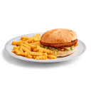 Kyllingburger med salat, løk, agurk, tomat og hamburgerdressing. Serveres med pommes frites.