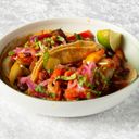 2 stk taco med panert scampi, servert med pico de gallo, hjemmelaget tacosaus, syltet løk, syltet rødkål, puré av svarte bønner og lime.